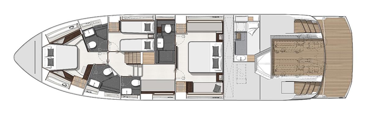 Das SkyHelm™, komplett mit IPS-Docking-Joystick, kann in aufrechter Position zum Manövrieren mit niedriger Geschwindigkeit verwendet oder abgesenkt werden, um perfekt mit ausgestreckten Arme zu fahren, wenn man tief in den maßgeschneiderten Steuersitzen sitzt, die durch Kohlefaserlehnen und eine integrierte Mittelkonsole geschmückt sind. Das modulare Layout ermöglicht verschiedene Spezifikationen und Verbesserungen, mit Raum, der sich nahtlos an alle Arten von Geselligkeits- und Adrenalin-Gesuchen anpasst. Drei Kabinen, einschließlich einer Master-Kabine, können bis zu sechs Gäste in luxuriösem Komfort unterbringen. Ebenso eine eine voll ausgestatteten Crew-Kabine vor der Garage. Bringen Sie Ihre Sportyacht auf neue Höhen, indem Sie das Beiboot auf der Badeplattform tragen und den freien Platz als "Beach Club" neu konfigurieren - mit direktem Zugang zum Meer, Bar, Kühlschrank, Grill und freistehenden Sitzgelegenheiten. Der perfekte Bereich für diejenigen, die am glücklichsten in der Nähe des Wassers sind. Mit Geschwindigkeiten von bis zu 35 Knoten macht die 65 Sport Yacht auf dem offenen Wasser eine ebenso beeindruckende Figur. Insgesamt ist die Erfahrung eine von reinem Adrenalin, ähnlich dem Fahren eines Hochleistungs-Sportwagens.